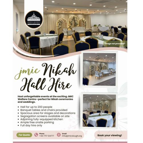 To ensure ample preparation and availability, we kindly request that Nikah bookings be made at least four weeks prior to your intended date. Please be advised that the summer months are particularly popular for Nikah ceremonies, so early booking is strongly recommended to secure your preferred date and avoid disappointment.